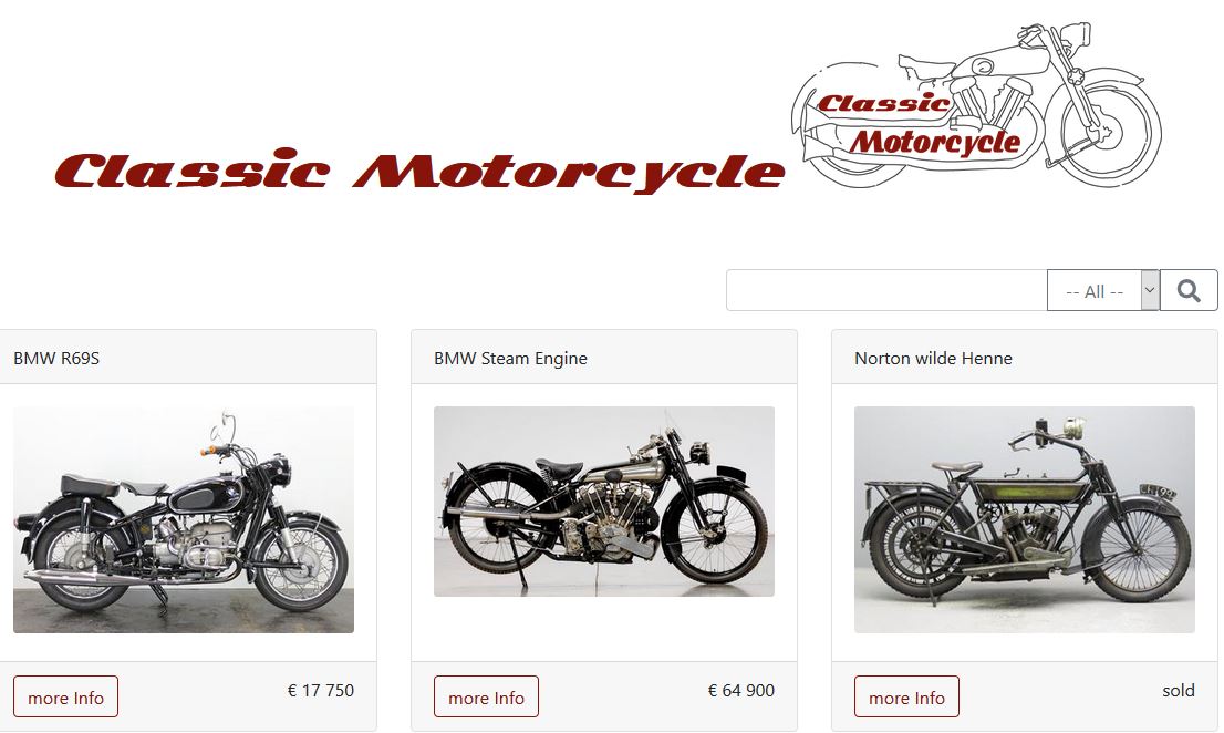 Als Verkaufs und Präsentationsplattform wird diese Webanwendung verwendet. Der Kunde verkauft hier weltweit antike seltene Motorräder.
